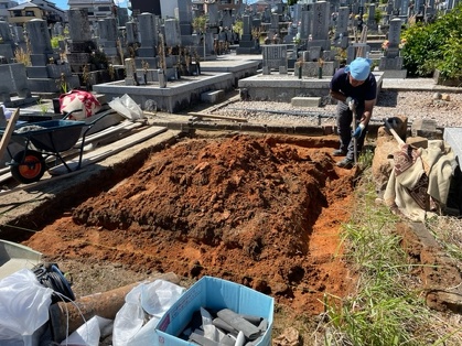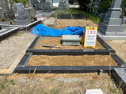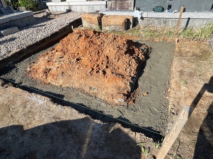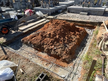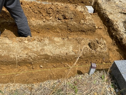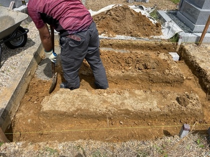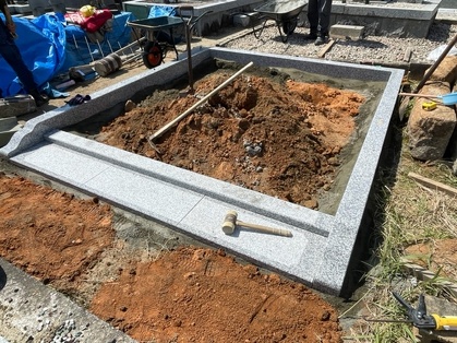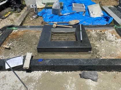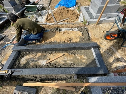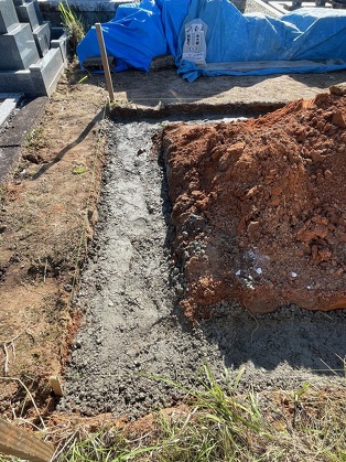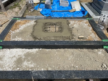 基礎の床掘りを十分に行い、鉄筋を組んで生コンを打ちました。墓所の土壌自体柔らかい場所でもあり、裏側からの水が流れる所ですので入念に基礎を通常よりも強く厚く施工させて頂きました。