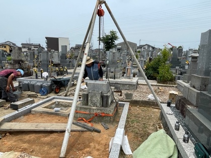 新しい芝台と四ツ石を据え付けした後に、今までの墓石(8寸角)を据え付け。