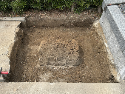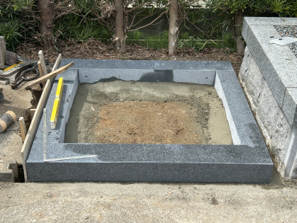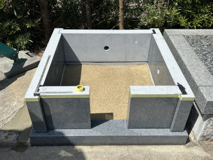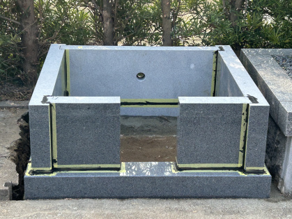 丘カロートの土台設置状態(ステンレス金具と耐震用コーキングにて固定)