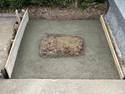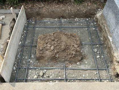 区画割りをブロックで作られていたので、ブロックを取り外し約30センチ程床掘りを行い、転圧後砂利、生コン(鉄筋)を打ち基礎工事完了