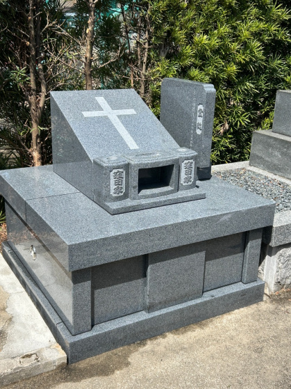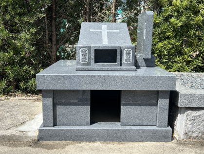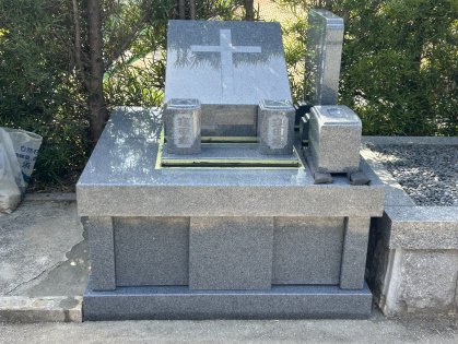 キリスト教のお墓をご希望ということで、正面に十字架を彫りシンプルな形をデザインさせて頂きました。お寺様の一角をお借りして建てるということでしたが、お寺様もご承知していただきスムーズな工事をさせて頂きました。墓所の枠がブロックで仕切られていたので、ブロックは取り外し基礎に生コンを打ち丘カロート(外柵)を建てさせて頂きました。