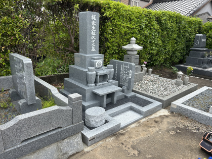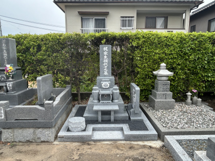 青御影石(石の目の細かい糠目)のインド産石を選ばせて頂き、墓石を建立させて頂きました。当初ご実家の裏山に古い墓石が多数あるので移設も話しとしてありましたが、今回は移設(処分)はせずに新しく墓石のみを建立とさせて頂きました。お子さんやお孫さん達の近くに墓所があるので、皆さんで管理しあってもらえればと思います。飽きのこない、シンプルな形を設計させて頂きました。