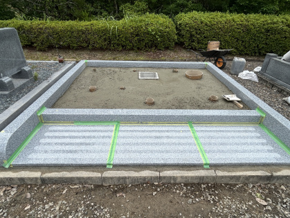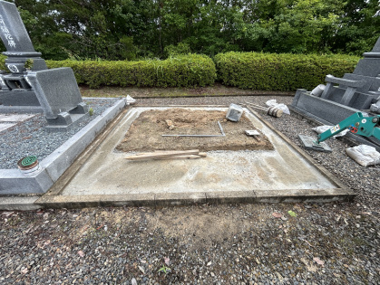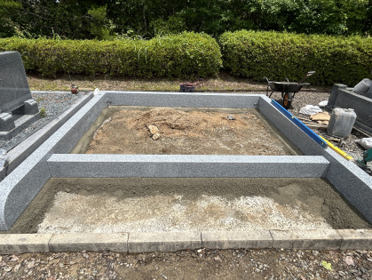 しっかりと墓所の床掘りを行い、鉄筋&生コンを打たせて頂き、外柵も据付させて頂きました。