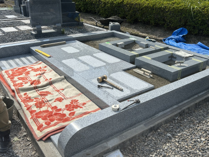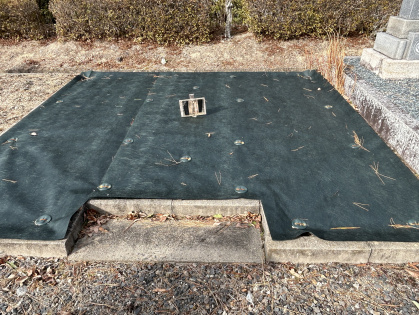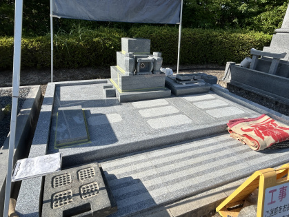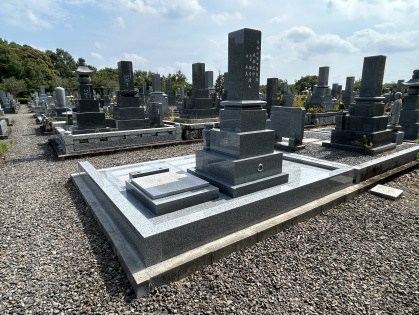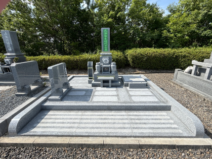 今回は古瀬間霊園に新しい墓石と墓誌、外柵のみを建立させて頂き、防草対策で板石をはめ込む施工をさせて頂きました。見た目もすっきりとした形とすることができました。数年後、古い墓石を移設できるように左右にスペースを設けさせて頂いております。