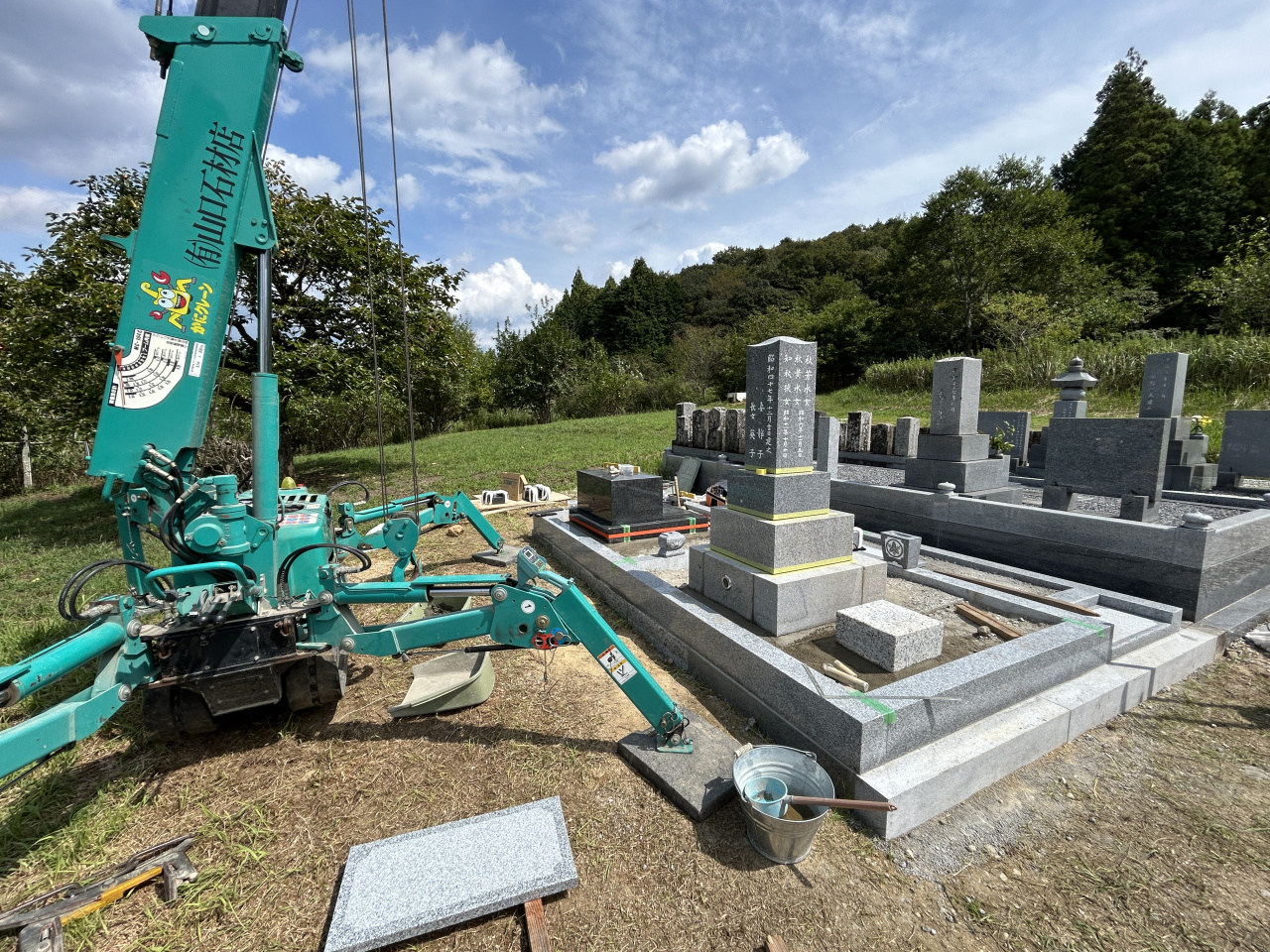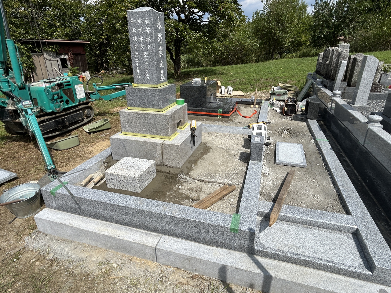 外柵の外枠の延石が前の墓所の方にもあるので、延長みたいな感じで古い延石を据え付けさせて頂き、その後きちんと古碑も枠の中に据付させて頂きました。
