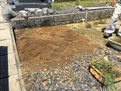 墓地のサイズは1.5m×1.5m。墓地自体が向かって左側に勾配がついているので、高さ調節を考えながら施工をさせて頂きました。