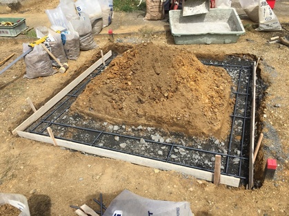 砂利を敷いてランマで打圧した後、鉄筋を組み込みコンクリートを入れる準備ができました。