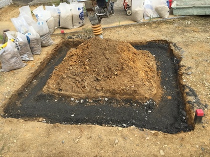 基礎のしっかりと掘り起こし、ランマで打圧しながら砂利を敷き詰めました。少し勾配のある箇所でしたので高さ調節を行いながらの工事でした。