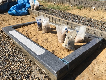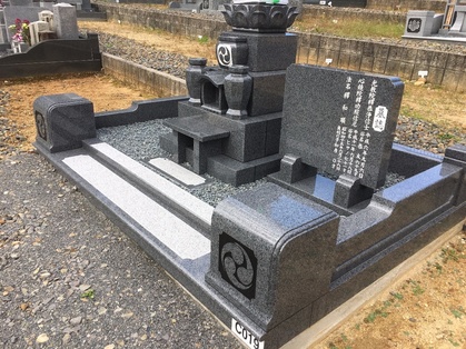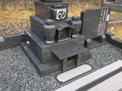 8寸角墓石(芝台、レンゲ台、水垂れ付き)、墓誌(ゲタ、墓誌台付き)、那智石(2分)を配置して完成しました。四ツ石の裏と供物香炉の中に通気孔の蓋が付けてあります。