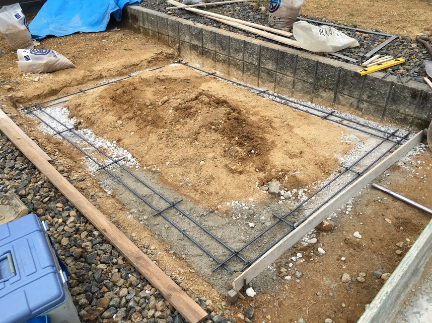 左右に勾配があるので、高さ調節を行いながらの基礎工事を行いました。しっかりと基礎を彫り込み、砂利を敷いてランマで転圧を行い、鉄筋を組み込みました。