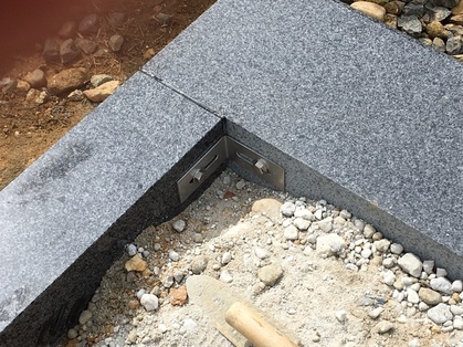 外柵はステンレス製のコーナー金具を使用し、石材用のボンドで接着を行いました。真ん中の白い部分は滑り止め加工を施してある部分です。