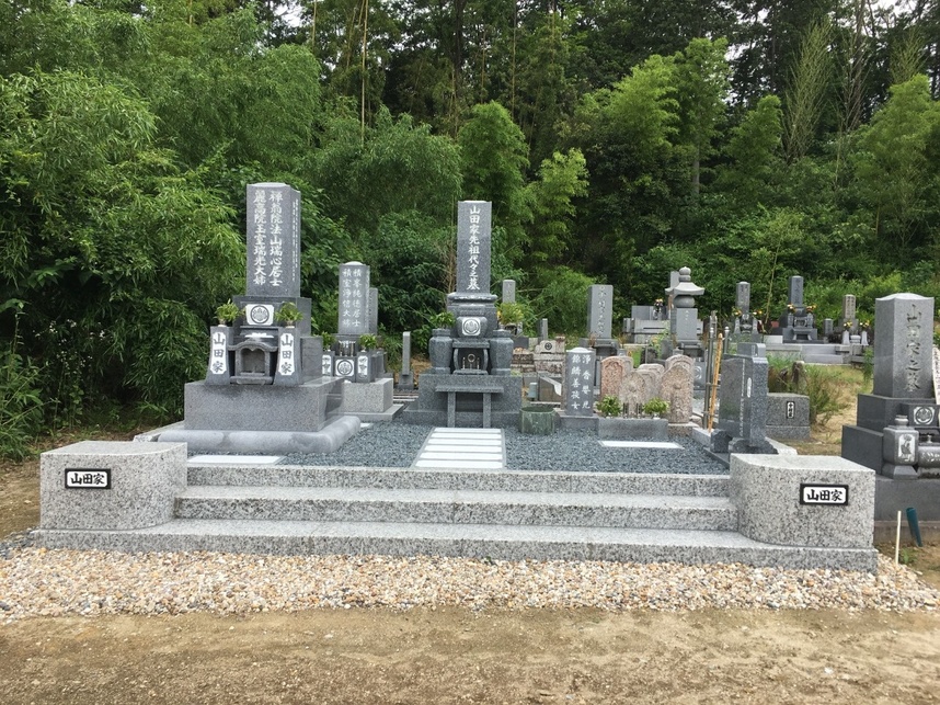 山田様の墓所の一番真ん中に新しい墓石(10寸角)を建立させて頂きました。その墓石の向かって右側に古い墓石(小墓石)をまとめて並べ直し、左側に先々代の個人墓(8寸角)を建立。そして、現存の10寸角の墓石を位置そのままで基礎工事をしてから、据え直し工事を行いました。