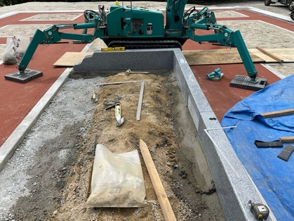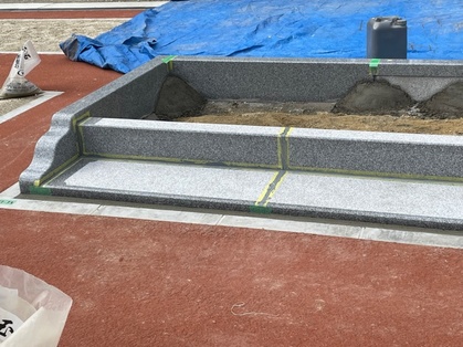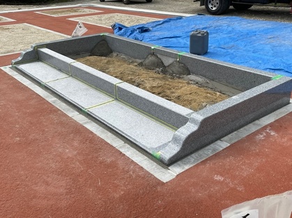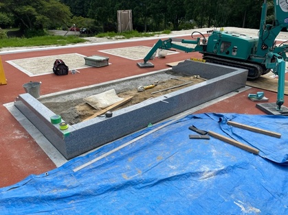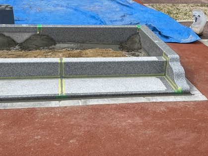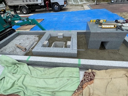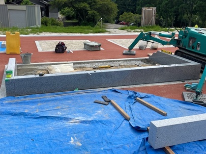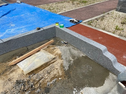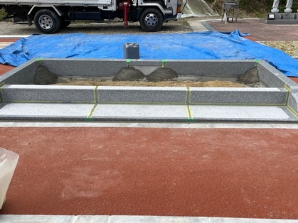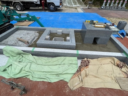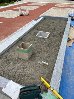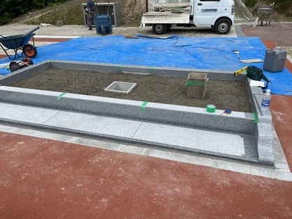 基礎の生コンが乾いたので、墓石の芝台、五輪塔の一番下の台を設置