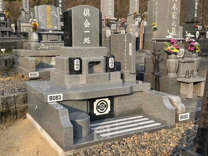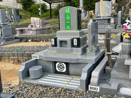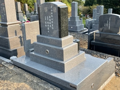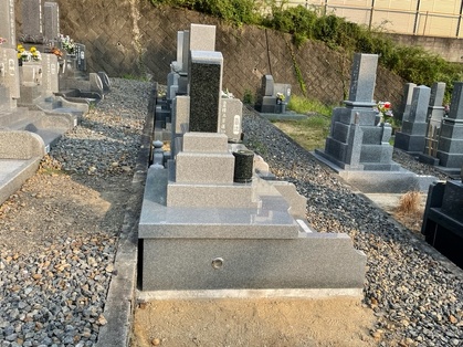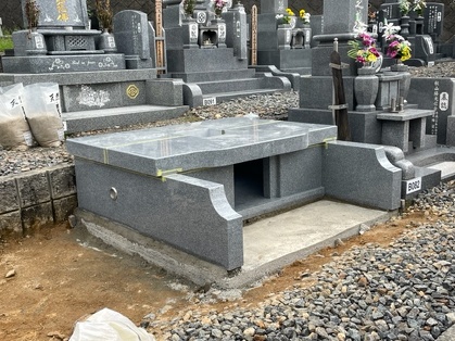 骨壺のままの納骨ですと、舞台型が良いのでご提案させて頂きました。後継者の息子さん達が墓参、管理がしやすい形をご提案させて頂きました。掃除などが簡単にでき、草は生えないように板石を敷き詰めてあります。