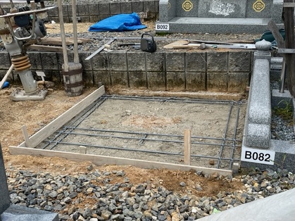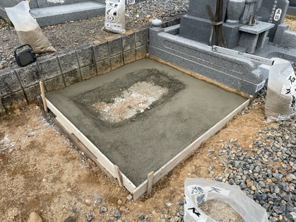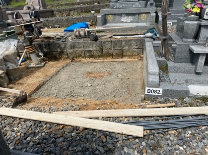 基礎工事開始! 地形が左斜めに下がっている場所なので勾配を計算しながら基礎コンクリートを打ちます。一見裏の墓石も斜めに見えてしまうかもしれませんが、墓石は真っすぐに建立されています。