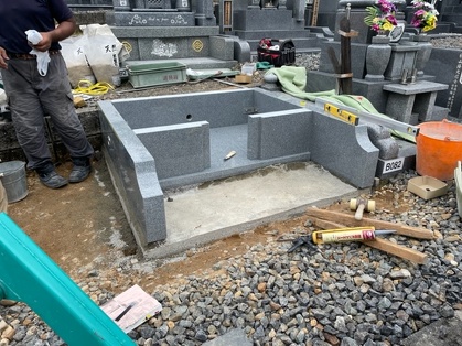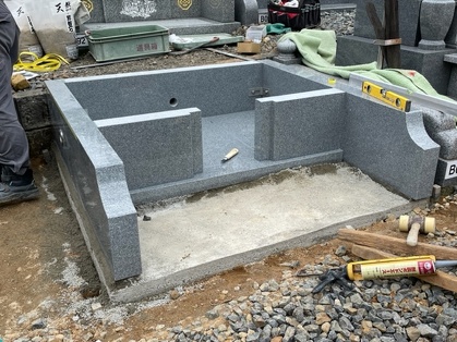 舞台を据え付けした後、骨壺を置くスペースの板石貼りを施工。裏や右横にブロックや他家の墓石がありますが、なるべく換気ができるように舞台だけでも3つ換気口を付けさせt頂きました。