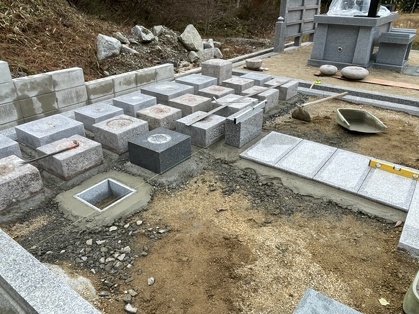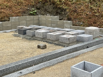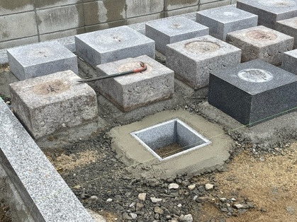 台石とコンクリートが固定された後に順番に棹石を建てていきました。すべて耐震用のコーキングとセメントにて固定してあります。