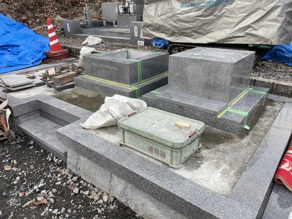 今回は生コンの上に墓石が建立している対応を取らせて頂き、二度と傾かないような仕組みになっております。