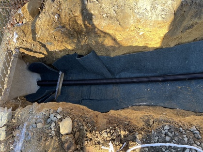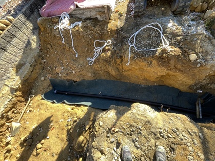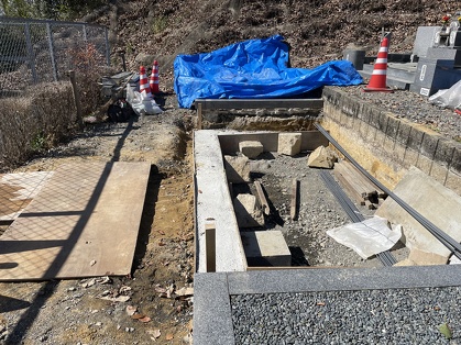 完全に墓石、墓誌(2枚)、外柵(延石、間知石)全てを一旦取り除き、基礎の下の土(深さ約1m)を掘り出しました。その後、墓所の前にある貯水池に向けて暗渠を設置し、とにかく水が溜まらないような仕組みをとらせて頂きました。