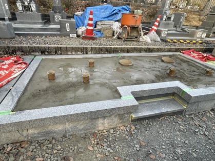 今回は墓石が再度傾かないように、墓所内全体にも生コンを打ちました。