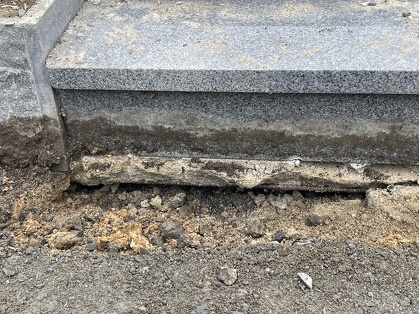 昨年末に施工させて頂いた同じ墓所の同列の『篠澤様』と原因は同じで水はけが影響して外柵、墓石が傾き、階段前に大きな穴が開いてしまってと思われます。