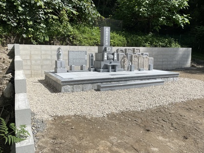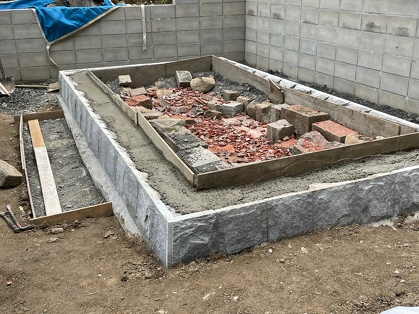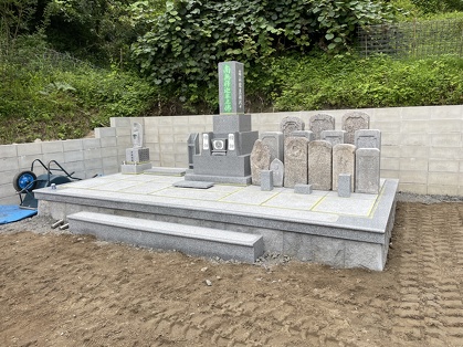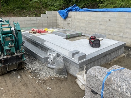 旧墓所よりラフター(移動クレーン車)を使って地上に降ろし、現墓所は(水気が多かったので)ブロックを積み暗渠を埋め込み水はけの良い墓所への作り変えました。