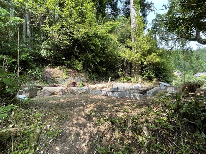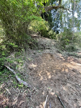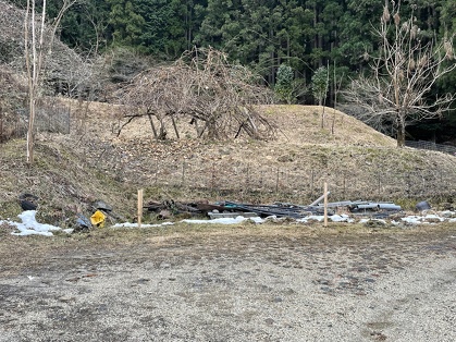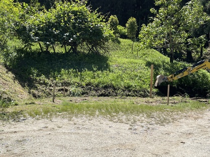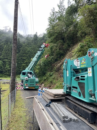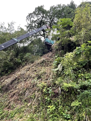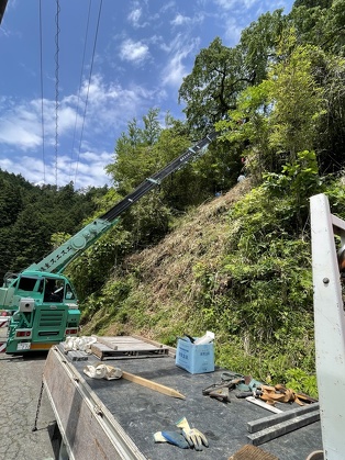大型クレーン車を使って墓石を地上に吊って下ろすために、クレーン車がギリギリ届く中腹場の木々を切り整地を事前に行いました。