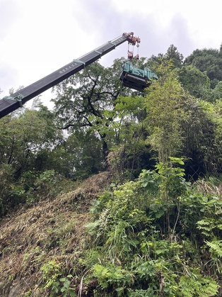 大型クレーンを使って墓石を地上に降ろすために、小型の移動式クレーンを中腹まで吊り上げました。