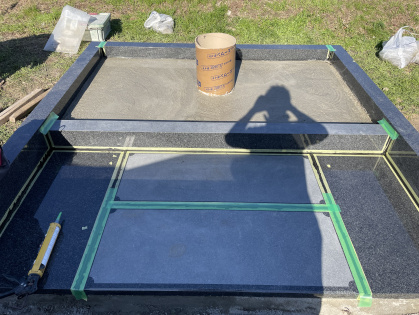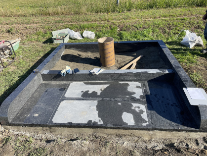生コンの上に外柵(囲い)の部材を据え付け、墓石が乗る部分に関しても生コンで固めてあります。