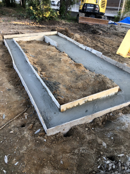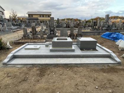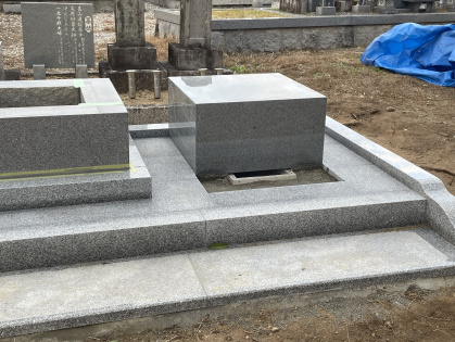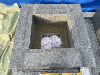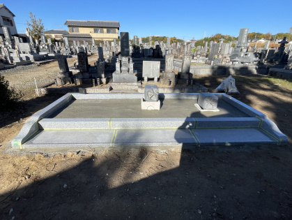 外柵と墓石の基礎を据え付けした状態。墓石の中にはもともと納まっていたお骨と、別の墓所にあった土葬墓からでたお骨をいれてあります。