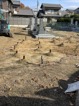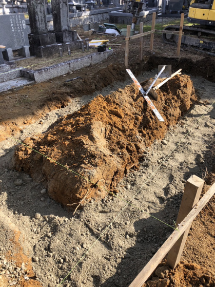 まず古い墓石(10基)を撤去。9寸角の墓石、墓誌は一旦解体を行い基礎工事を行います。