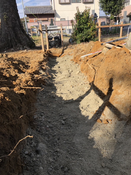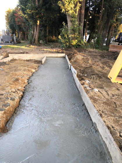 となりの樹木の根が既存の施主様の墓所内にも侵入してきています。新しい墓所は奥行を約半分のサイズにして、右横に約80㎝程ずれたので多少根の浸食からズレる状態になりました。根が伸びて来てもある程度は邪魔をしないように生コンをしっかりと打ちました(鉄筋も)