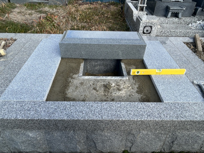新し墓所は、基礎工事に生コン、鉄筋を組み込みしっかりと時間を置いたあと後日台座、板石の据え付け施工