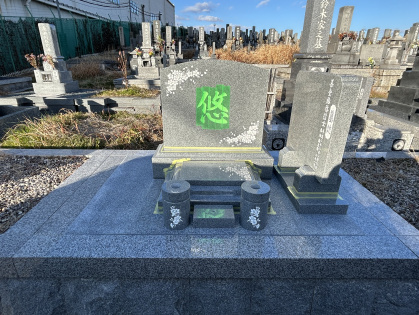 既存の外柵がある状態の墓所なので、墓石のみご提案させて頂きました。とにかく管理が楽なように既存の外柵(延石)と本体との隙間には板石をはめ込み防草対策したデザインで建墓させて頂きました。