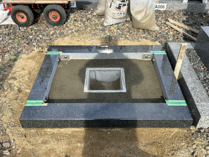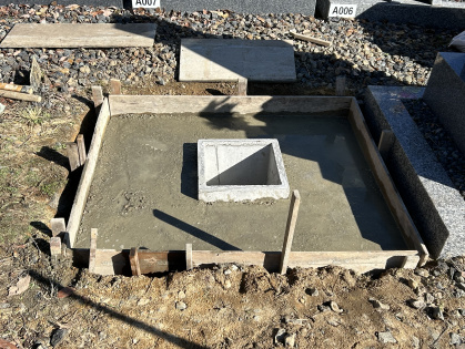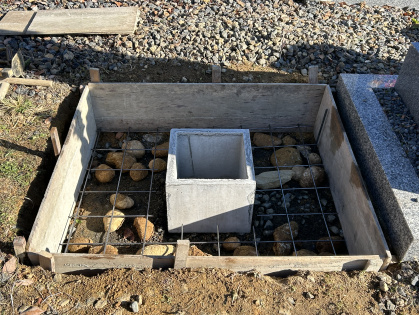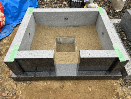 基礎の生コンがしっかりと固まったのち、墓台の据え付けです。