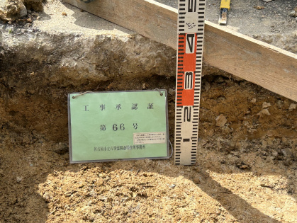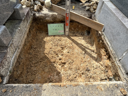 名古屋市緑区八事霊園管轄の有松町愛宕霊園での建立工事をさせていただきました。規定通り、床掘り30センチ以上を掘り隣接する墓石とコンクリートでの繋がりが無いようにきちんと分ける作業をさせて頂いた基礎工事の写真です。