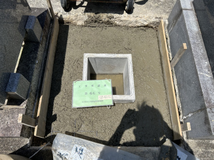 土壌の性質によるものだと思いますが、基礎工事の為に約30センチ以上掘ると、雨天明け水が下から湧き出てきてしまっておりました。そこで弊社は基礎に鉄筋を組み、生コンを流し込み、将来お骨が水に浸からないように工夫させて頂きました。