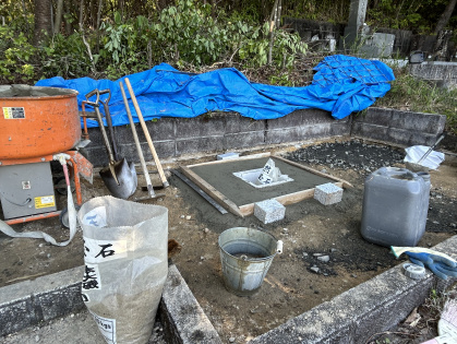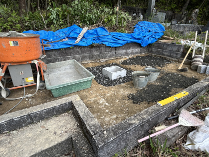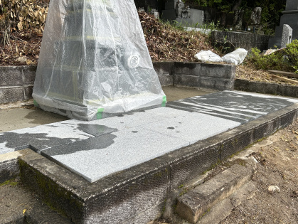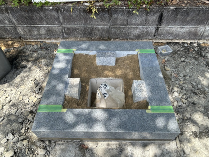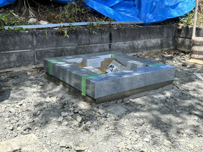 ブロックと墓石との間に板石をはめ込みました。かなりの力と根気がいる作業です。一枚一枚傾きを確認しながらですので、簡単な作業ではないです。勾配を間違えてしまうと水が溜まってしまうので汚れの原因にもなってしまいます。