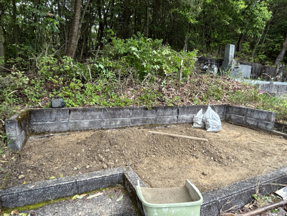既存のブロック全体を覆いかぶさるように裏側の木々が伸びてきてしまっているので、少し剪定作業をさせて頂きました。墓所の木ですので根本から切ることはせずに、枝払いのみさせて頂きました。