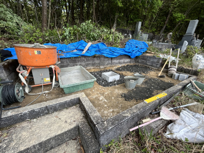 古い墓石を片付けさせて頂き、周囲の木々を枝払いさせて頂き工事開始です。