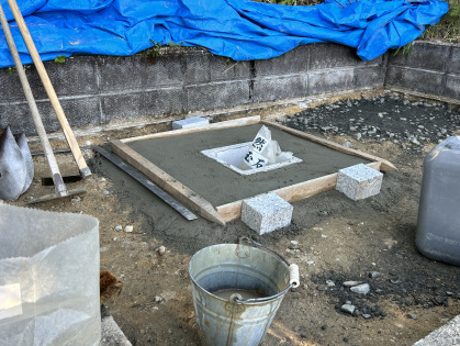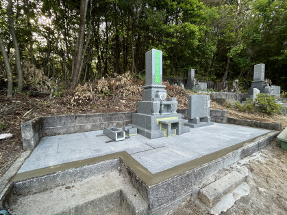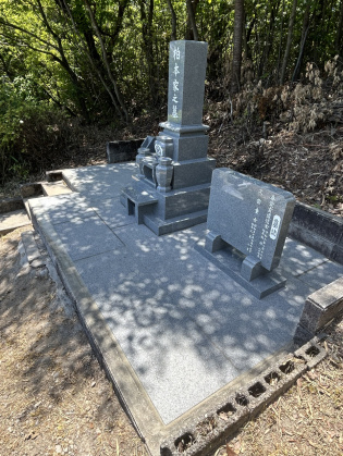 施主様もまだお若く、管理がしやすい墓所にするために既存の囲いのブロックと墓石との隙間に板石をはめ込み、落ち葉がホウキで簡単に掃くことができ、草も生えない形を設けました。