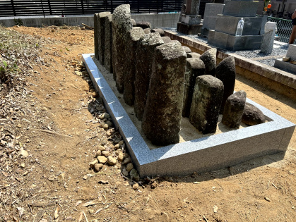 古い墓石を全て解体し、棹石のみ残し台座は処分させて頂きました。全ての墓石が収まるような囲いを設け棹石のみ並べさせてもらいました。