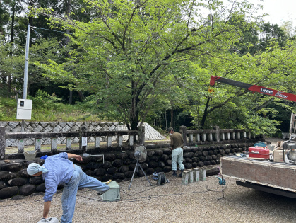 動いている小柱の上に載っている延石もトラックで吊り上げ、小柱との接着に耐震用ボンドとステンレス金具を入れて固定。玉垣自体は年数が経過しているが、古い時代の玉垣には『ほぞ』がきちんと作ってあったので、取り外すことはできませんでしたが、出来る限りの補強工事をさせて頂きました。