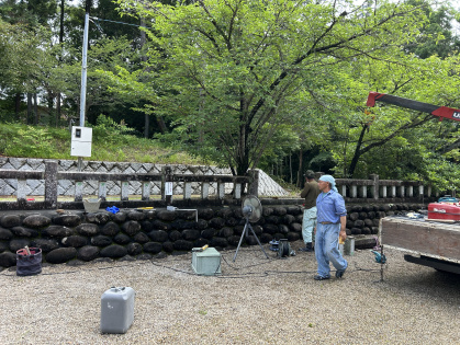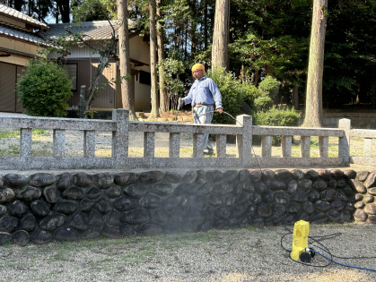 というのも秋の祭りの時期には、地元でも有名な『棒の手』を見に来場者が溢れかえる中、玉垣越しに見学をする方もいらっしゃいます。その際、万が一玉垣が倒れて子どもさんをはじめ、来場者にけが人でも出てしまってはいけないということで、動いている柱は全て取り外しを行い、耐震用のコーキングとステンレス棒を中心に入れて固定させて頂きました。また目地の部分でも隙間が出来ている箇所には、モルタルを詰めて補強をさせて頂きました。