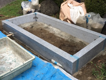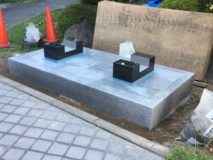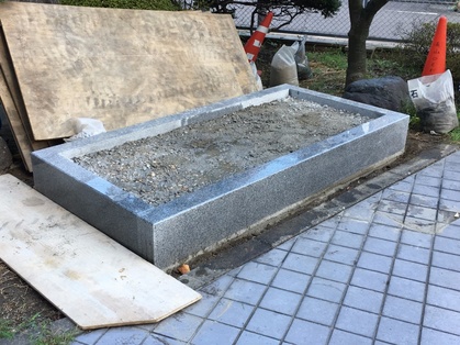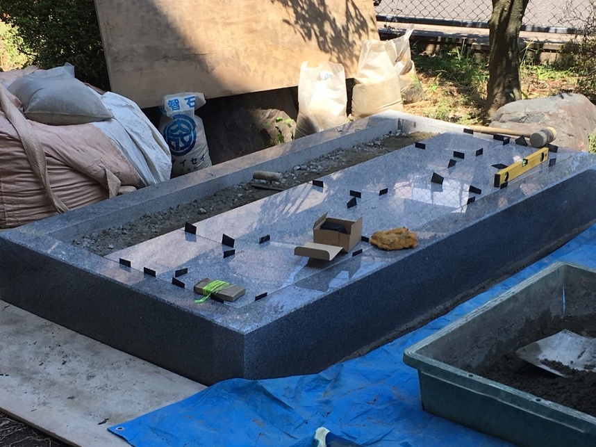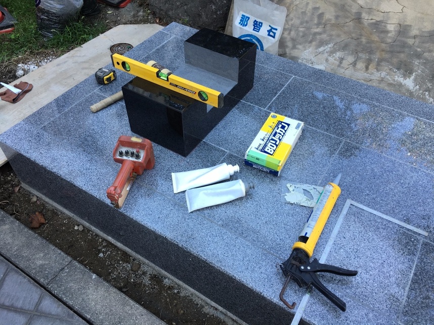 台座内の生コンが固まった後、枠内にセメントとコーキングを使用して板石をはめ込みました。