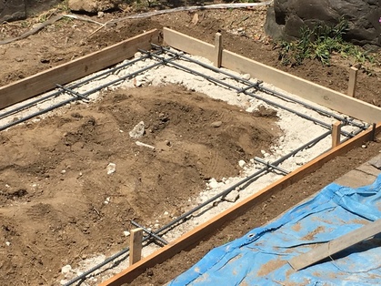 8月の暑い日に基礎をしっかり掘り、砂利を入れてランマで転圧を行いました。設置場所が道路面よりも低かったので高さ調節も行いつつ基礎工事を行いました。転圧後は鉄筋を組込み、セメントを打ちました。