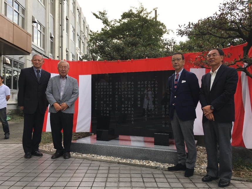 9月に学校にて文化祭が開催されました。その際に校歌碑の除幕式を行いお披露目をしていただけました。校歌碑の設置にご尽力を頂きました学校OB(市工会)の方々、校長先生との記念撮影です。ありがとうございました。