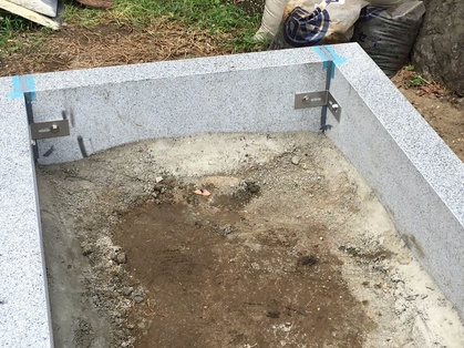 土台はコーキングを用いて接着を行い、ステンレス製の金具で固定しました。その後台座内に生コンを入れて数日間放置し、しっかりと固まるのを待ちました。