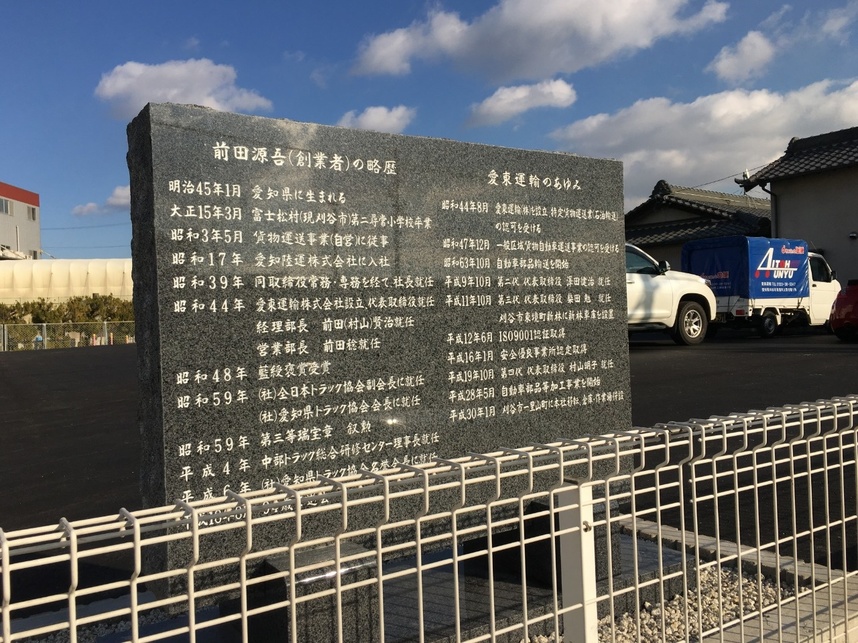 裏側には、愛東運輸㈱様の社歴が刻まれており、今後も記念すべき事業毎に追加彫りができるデザインになっております。